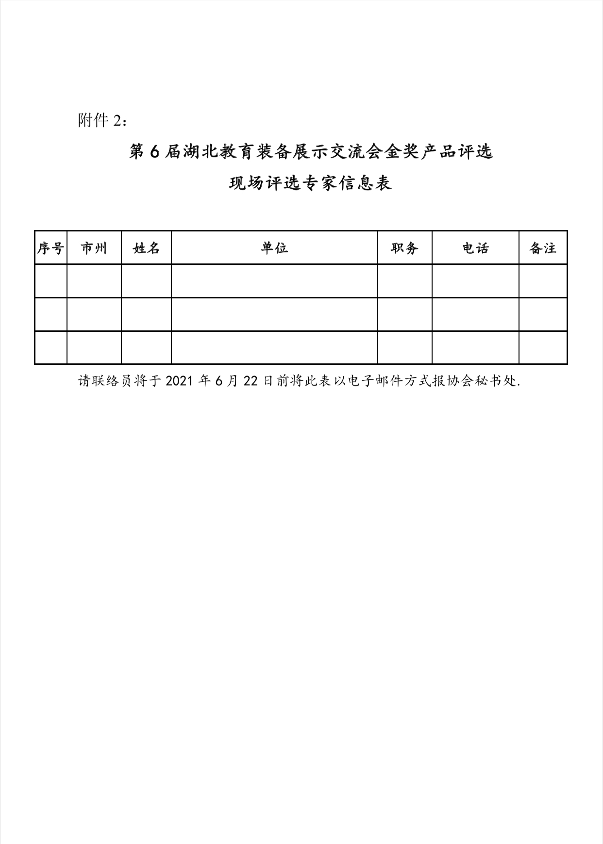 请仔细阅读以下通知,并于2021年6月22日前将“第6届湖北教育装备展示交流会金奖产品评选申报信息表”、“第6届湖北教育装备展示交流会金奖产品评选现场评选专家信息表”以电子邮件方式报协会秘书处(相关表格可在文末链接中点击下载)。